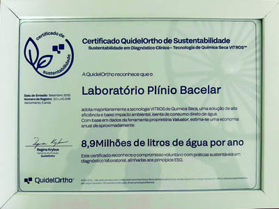 O Certificado de Sustentabilidade QuidelOrtho veio como reconhecimento à adoção da tecnologia de Química Seca VITROS®️, que garante ao Laboratório Plinio Bacelar uma economia de aproximadamente 8,9 milhões de litros de água por ano. Para efeito de comparação, o volume economizado permitiria encher cerca de quatro piscinas olímpicas, já que cada uma comporta 2,5 milhões de litros de água, demonstrando como o Laboratório Plinio Bacelar tem contribuído de forma significativa para a preservação de recursos naturais e um futuro mais sustentável para todos.